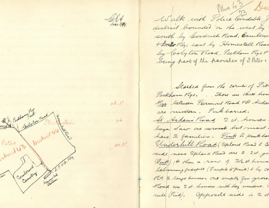 The religious influences series also includes a series of police notebooks, containing reports of over 300 walks undertaken by social investigators accompanying police officers around their beats. The reports of the walks record vivid descriptions of the streets of London, their inhabitants and often a description of the policemen. The report of each walk is accompanied by a sketch map of the area covered in the walk. A typical description indicates the type of housing, state of the roads, inhabitants if seen, their activities and type of occupations and the extent of poverty. Sometimes the descriptions go beyond this and include observations on the relationship of publicans and police, crime and drunkenness among men, women and children, and descriptions of ethnic communities.
